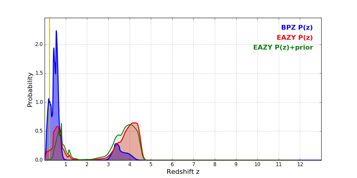 In P(z) plots: Yellow lines mark the cluster redshift z = 0.228,