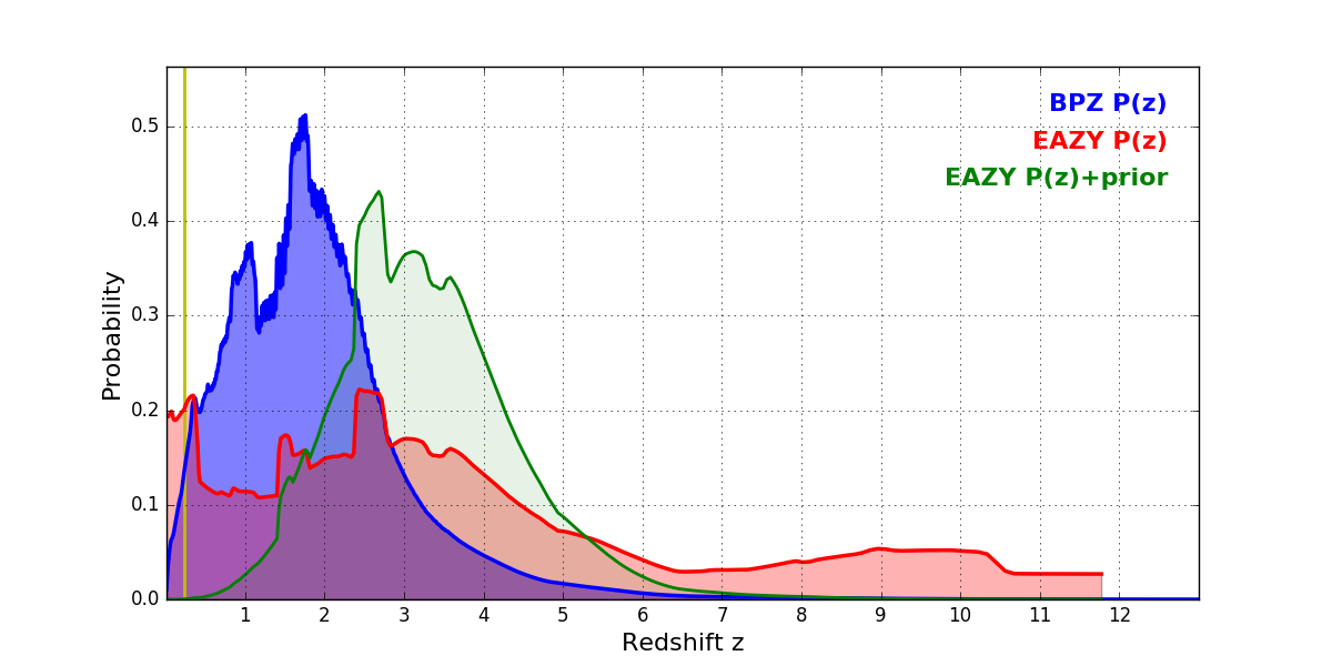 In P(z) plots: Yellow lines mark the cluster redshift z = 0.228,
