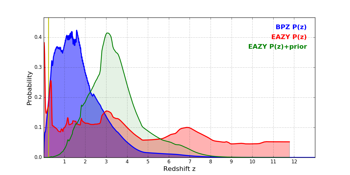In P(z) plots: Yellow lines mark the cluster redshift z = 0.228,