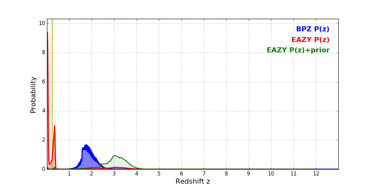 In P(z) plots: Yellow lines mark the cluster redshift z = 0.228,