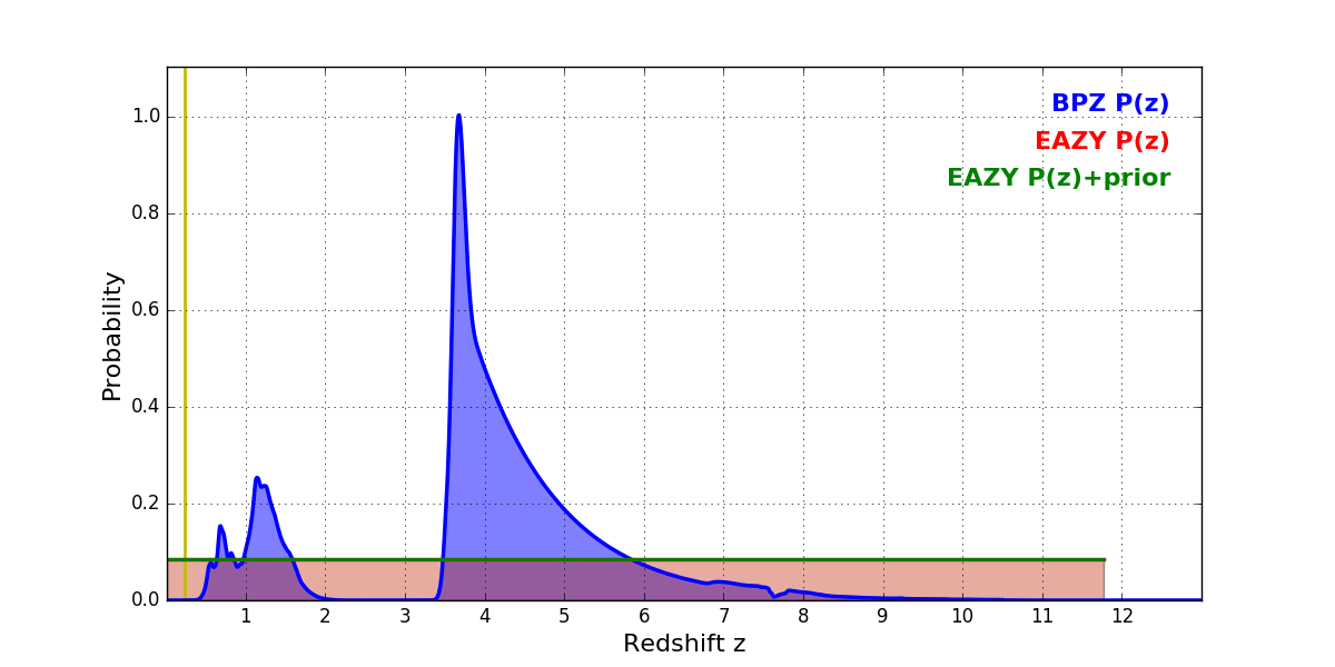 In P(z) plots: Yellow lines mark the cluster redshift z = 0.228,