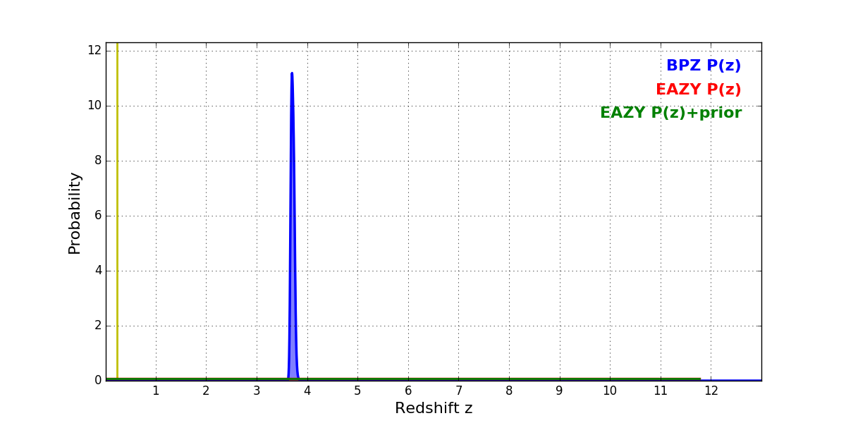 In P(z) plots: Yellow lines mark the cluster redshift z = 0.228,