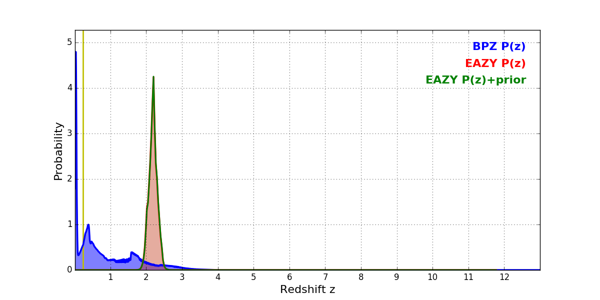 In P(z) plots: Yellow lines mark the cluster redshift z = 0.228,