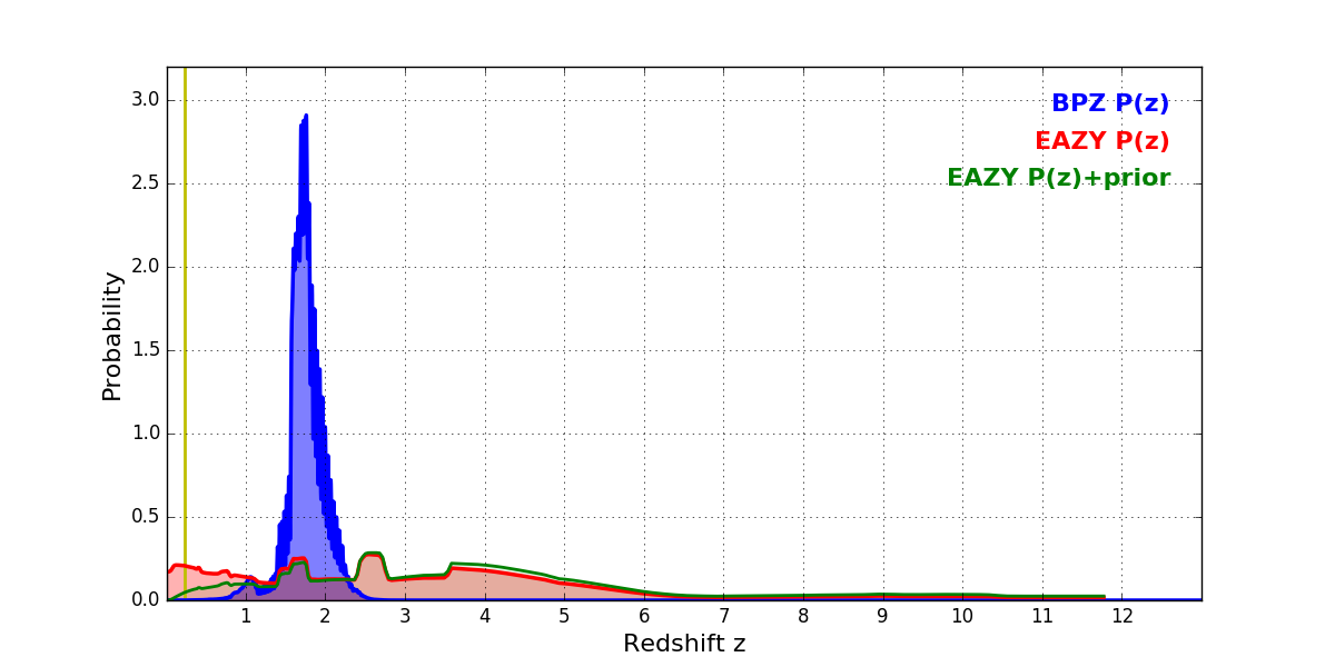 In P(z) plots: Yellow lines mark the cluster redshift z = 0.228,