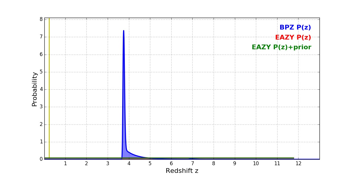 In P(z) plots: Yellow lines mark the cluster redshift z = 0.228,