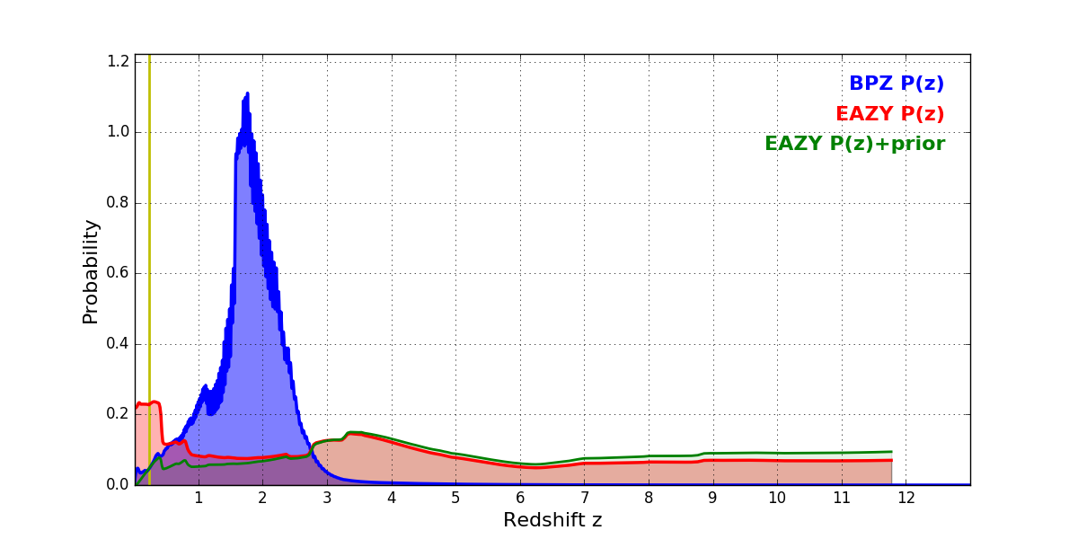 In P(z) plots: Yellow lines mark the cluster redshift z = 0.228,