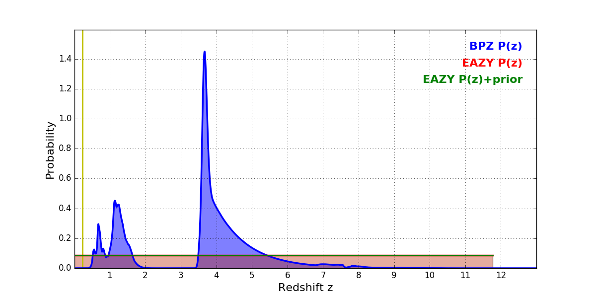 In P(z) plots: Yellow lines mark the cluster redshift z = 0.228,