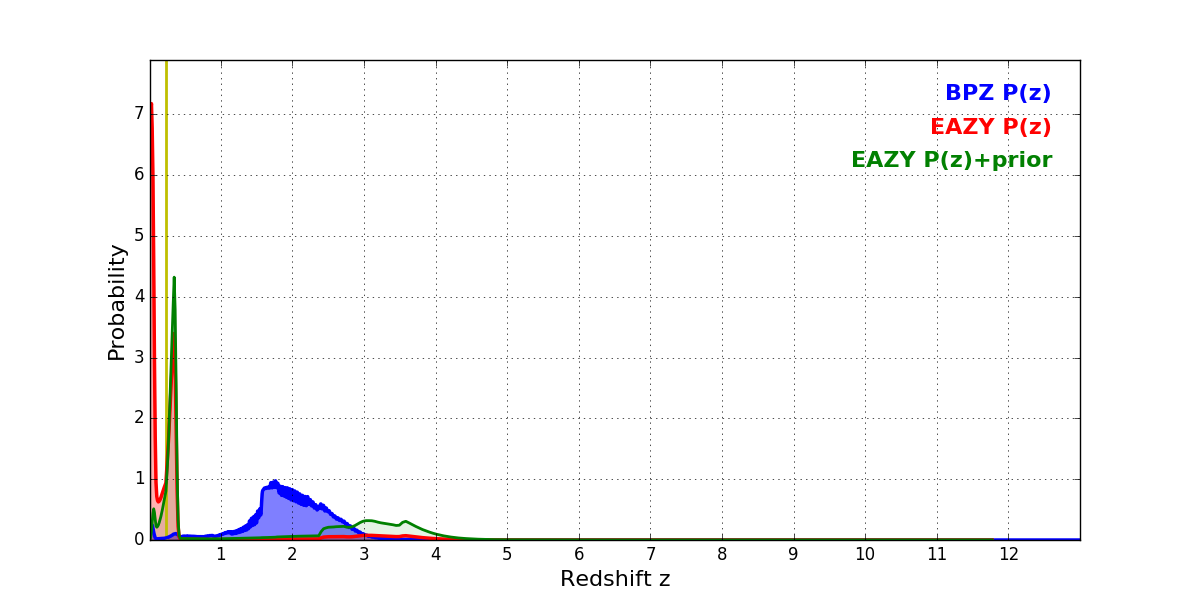 In P(z) plots: Yellow lines mark the cluster redshift z = 0.228,