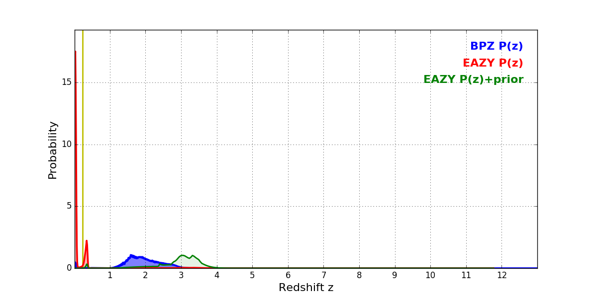 In P(z) plots: Yellow lines mark the cluster redshift z = 0.228,