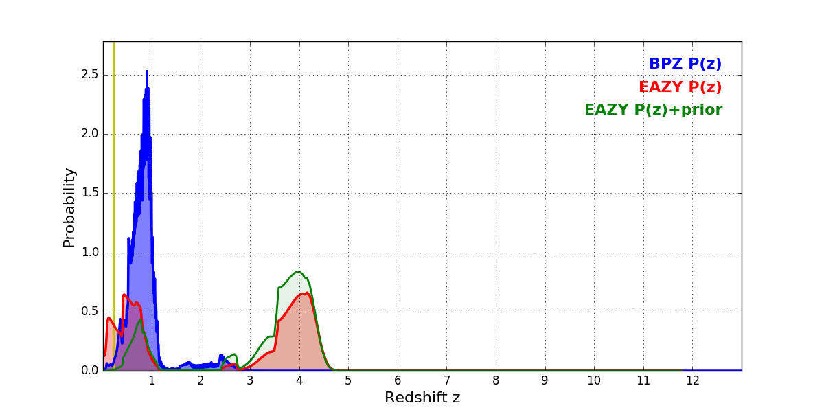 In P(z) plots: Yellow lines mark the cluster redshift z = 0.228,
