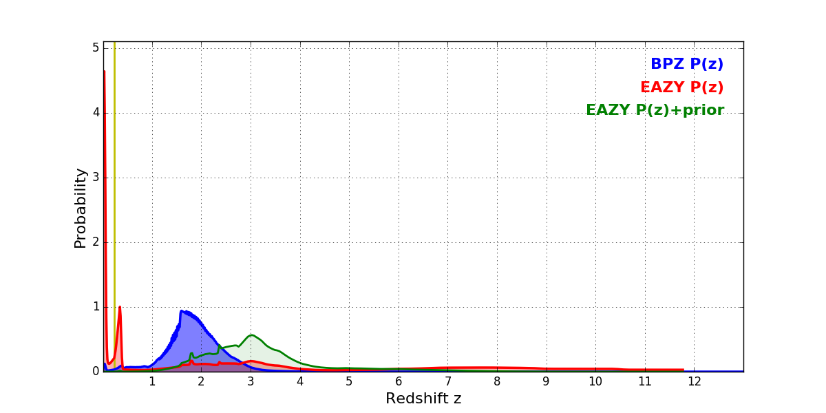 In P(z) plots: Yellow lines mark the cluster redshift z = 0.228,