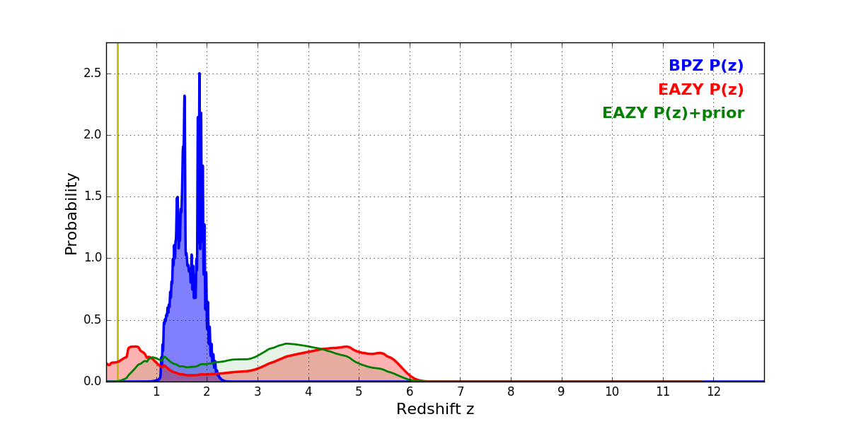 In P(z) plots: Yellow lines mark the cluster redshift z = 0.228,