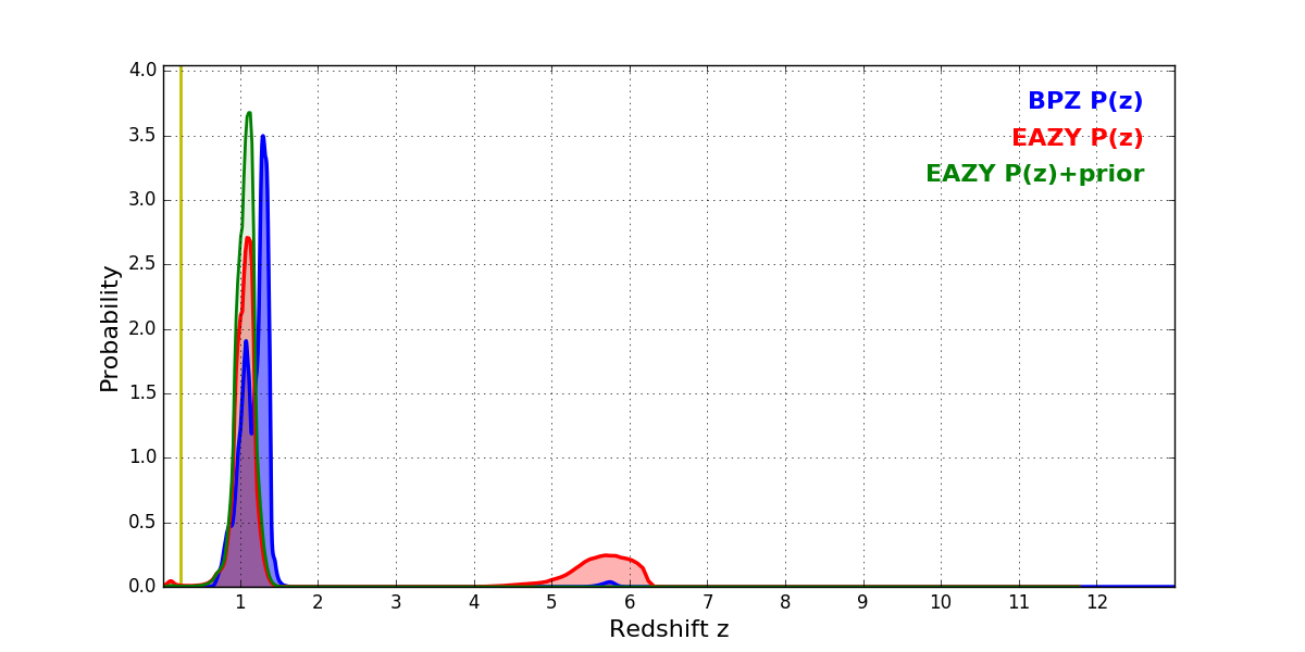 In P(z) plots: Yellow lines mark the cluster redshift z = 0.228,