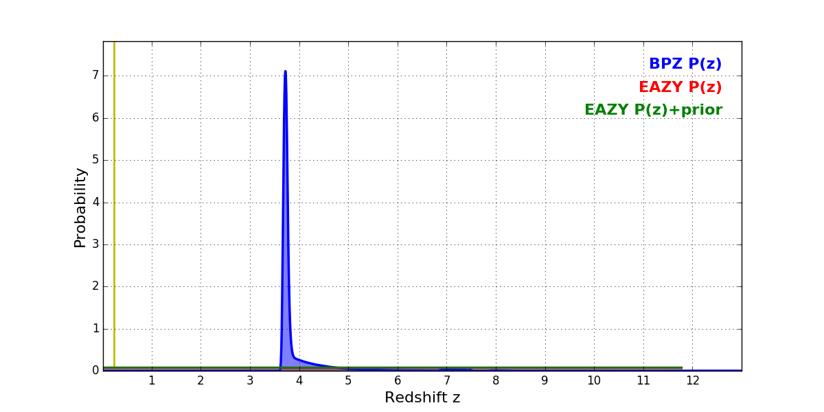 In P(z) plots: Yellow lines mark the cluster redshift z = 0.228,