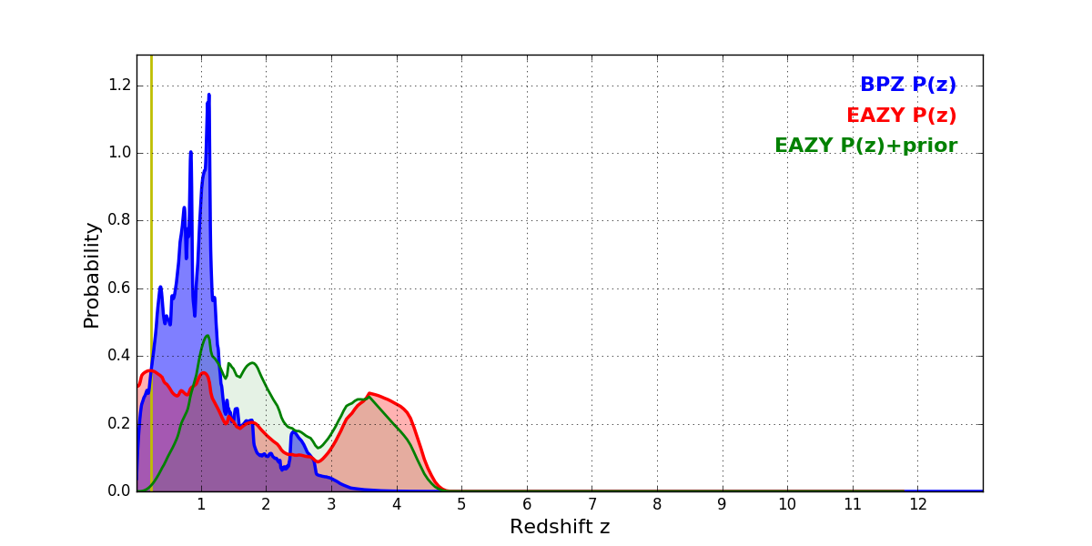 In P(z) plots: Yellow lines mark the cluster redshift z = 0.228,