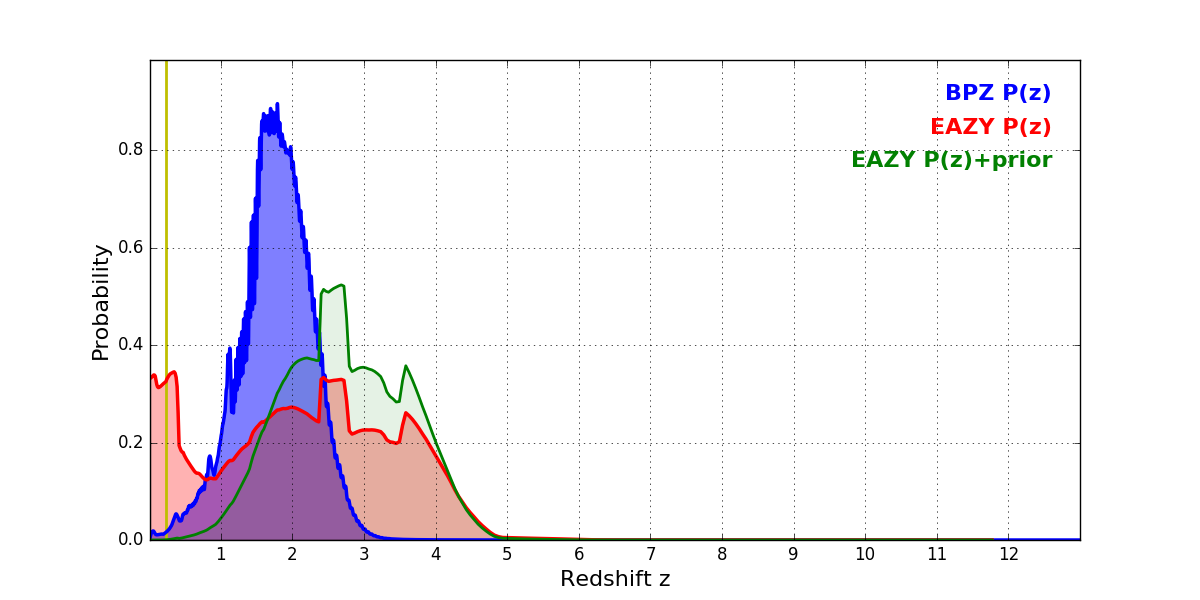 In P(z) plots: Yellow lines mark the cluster redshift z = 0.228,