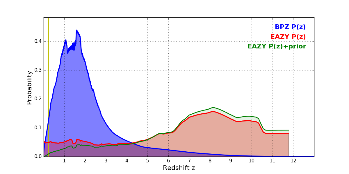 In P(z) plots: Yellow lines mark the cluster redshift z = 0.228,