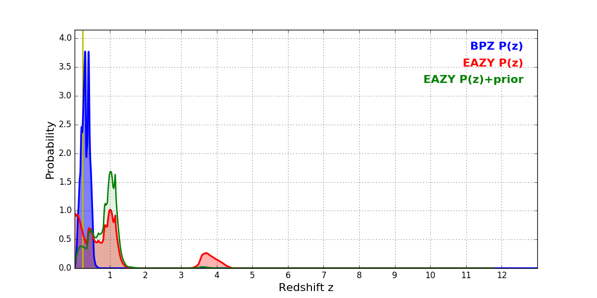 In P(z) plots: Yellow lines mark the cluster redshift z = 0.228,