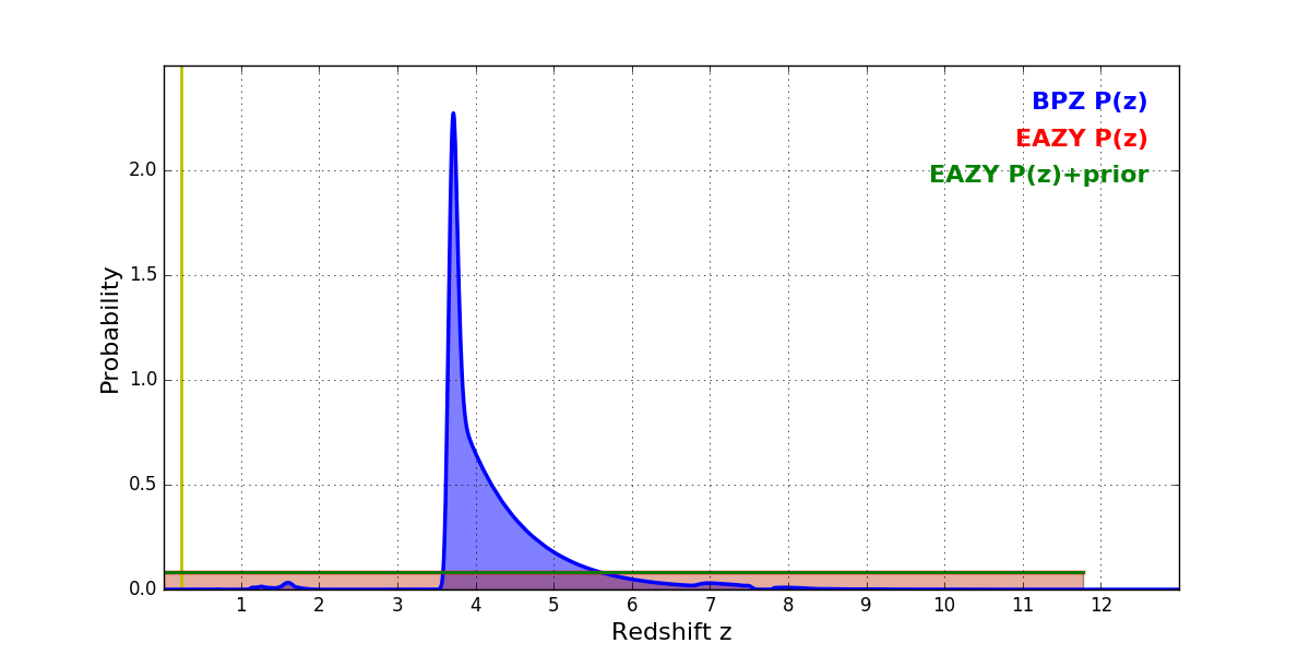 In P(z) plots: Yellow lines mark the cluster redshift z = 0.228,