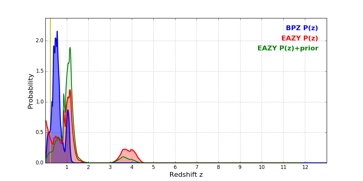 In P(z) plots: Yellow lines mark the cluster redshift z = 0.228,