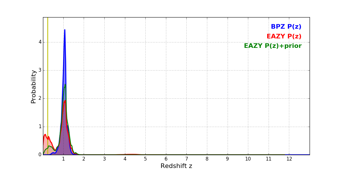 In P(z) plots: Yellow lines mark the cluster redshift z = 0.228,
