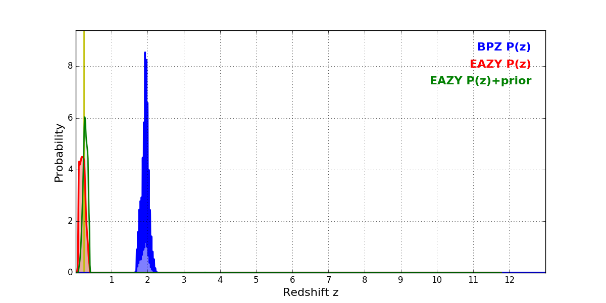 In P(z) plots: Yellow lines mark the cluster redshift z = 0.228,