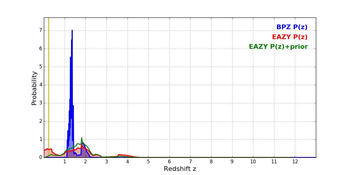 In P(z) plots: Yellow lines mark the cluster redshift z = 0.228,