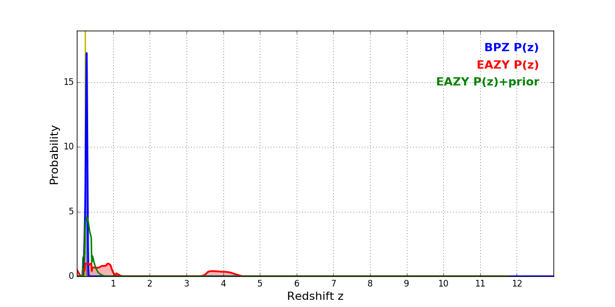 In P(z) plots: Yellow lines mark the cluster redshift z = 0.228,