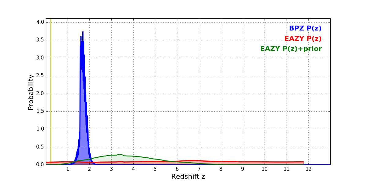 In P(z) plots: Yellow lines mark the cluster redshift z = 0.228,