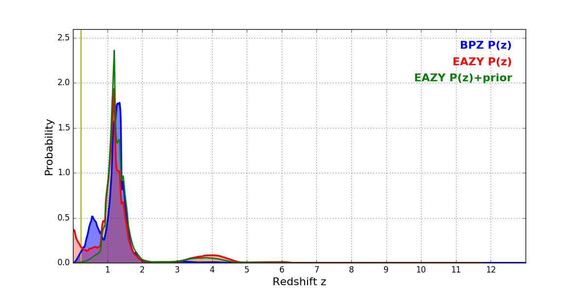 In P(z) plots: Yellow lines mark the cluster redshift z = 0.228,
