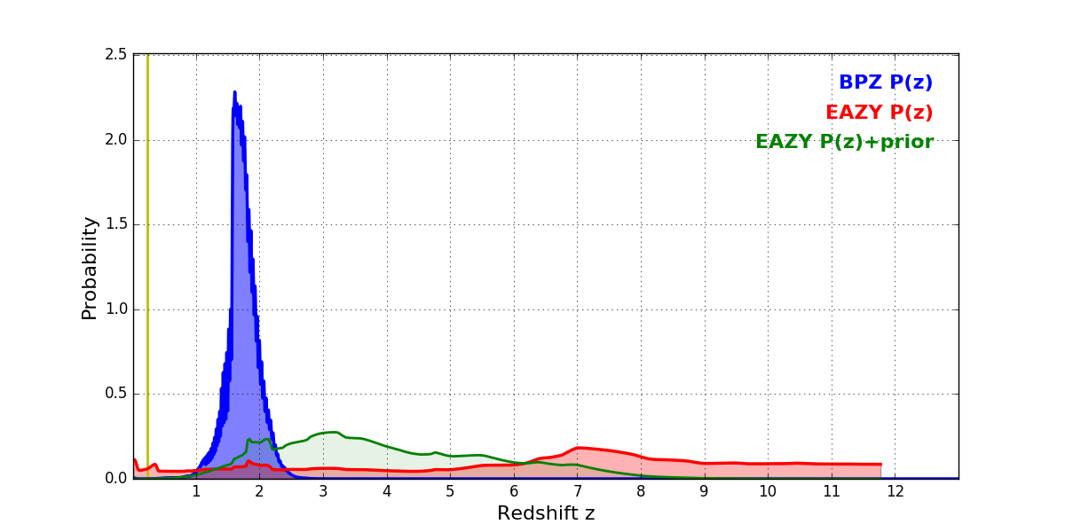 In P(z) plots: Yellow lines mark the cluster redshift z = 0.228,
