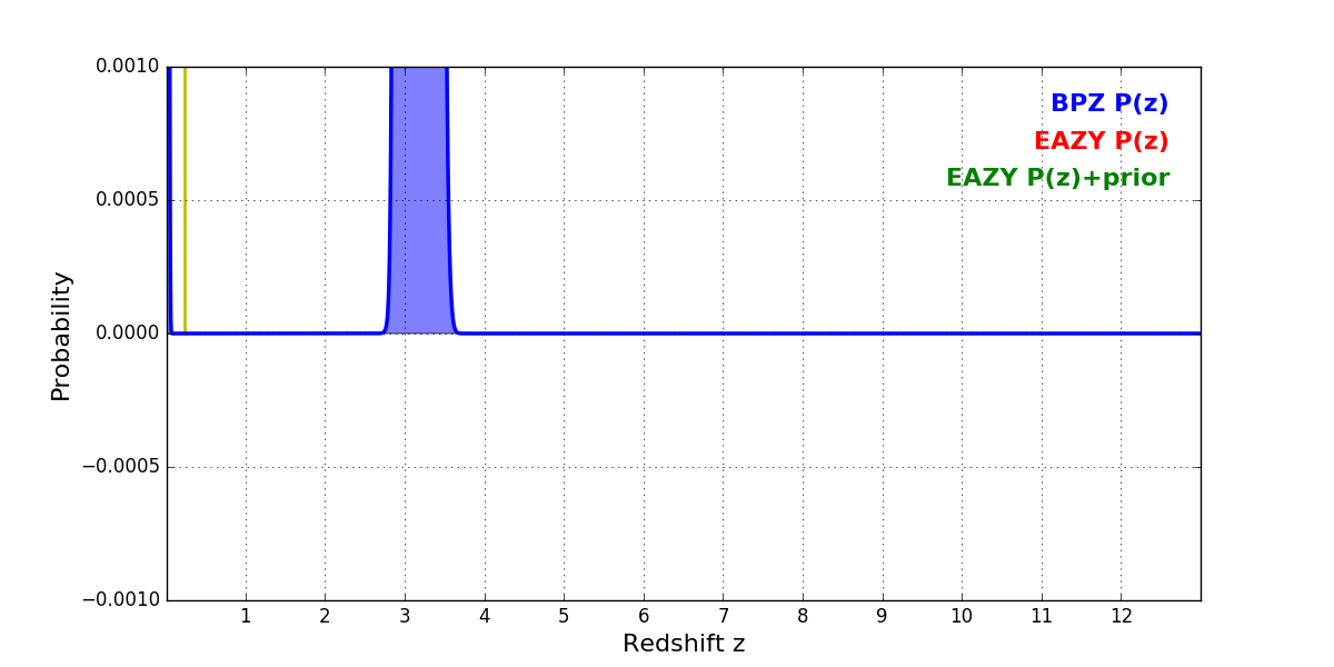 In P(z) plots: Yellow lines mark the cluster redshift z = 0.228,