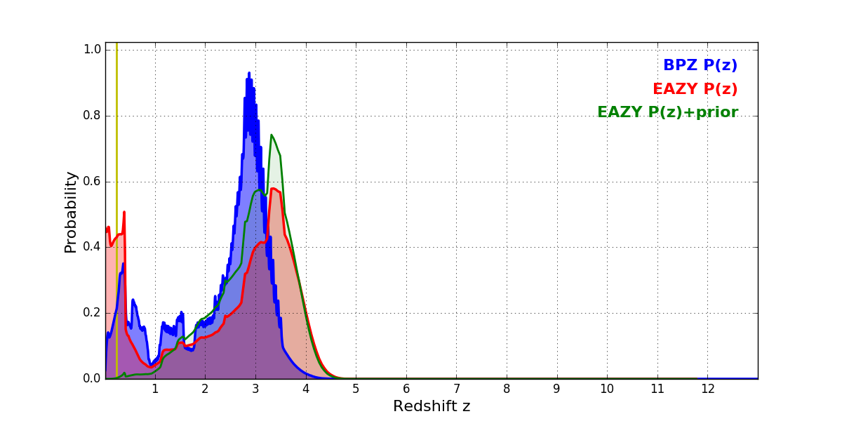 In P(z) plots: Yellow lines mark the cluster redshift z = 0.228,