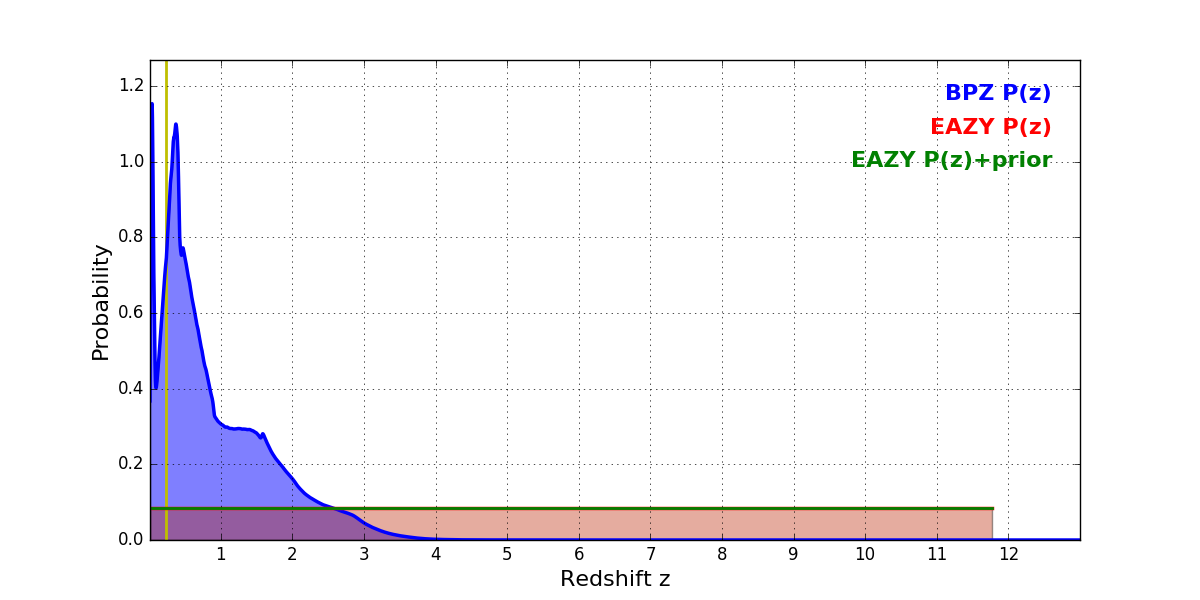 In P(z) plots: Yellow lines mark the cluster redshift z = 0.228,