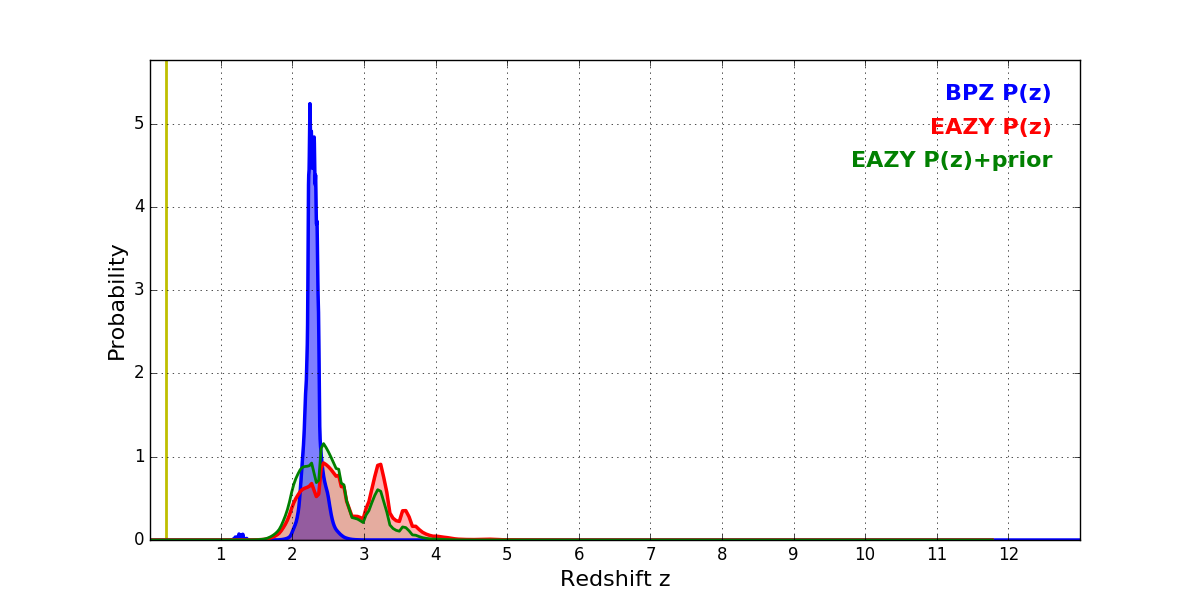 In P(z) plots: Yellow lines mark the cluster redshift z = 0.228,