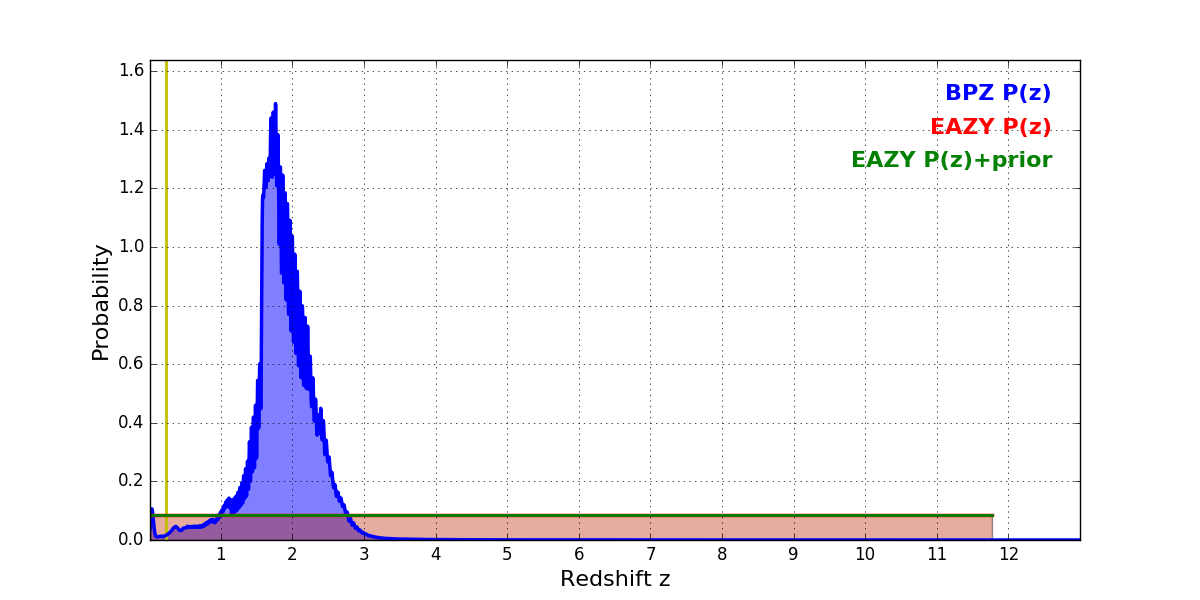 In P(z) plots: Yellow lines mark the cluster redshift z = 0.228,