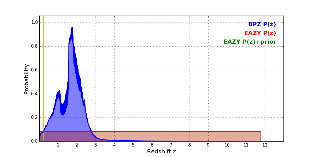 In P(z) plots: Yellow lines mark the cluster redshift z = 0.228,