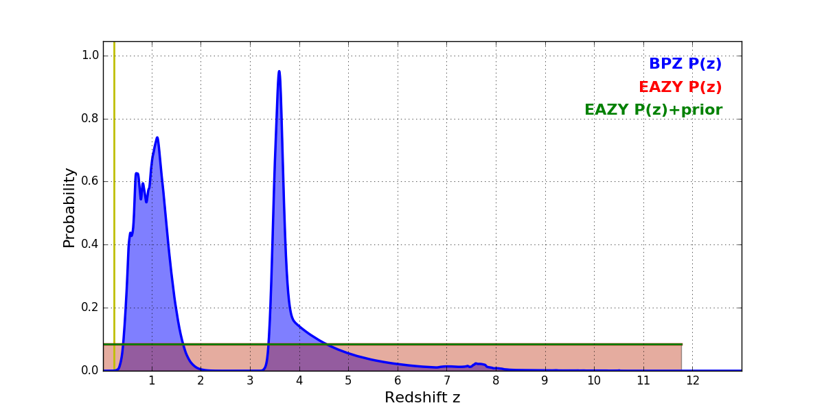 In P(z) plots: Yellow lines mark the cluster redshift z = 0.228,