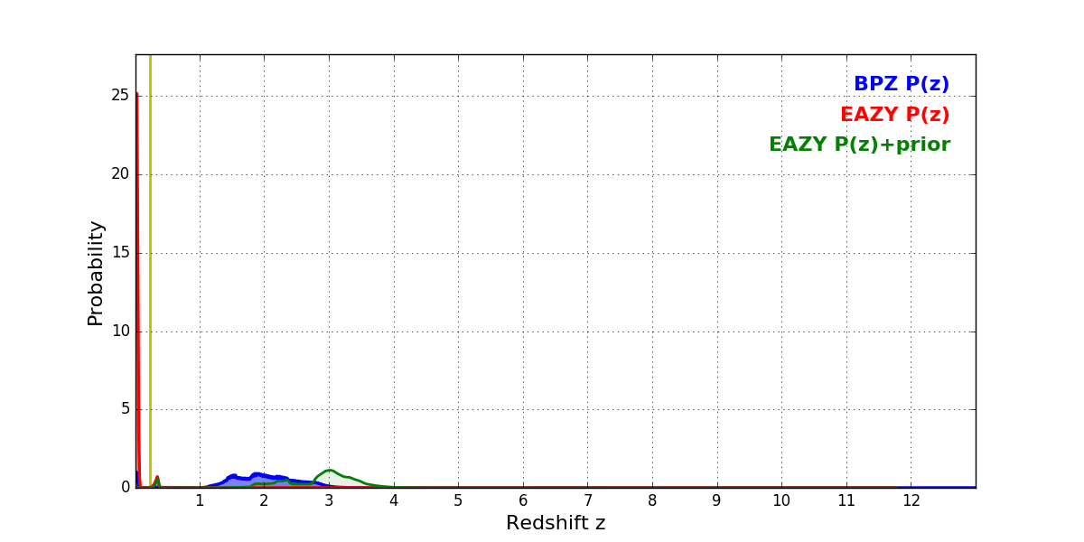 In P(z) plots: Yellow lines mark the cluster redshift z = 0.228,