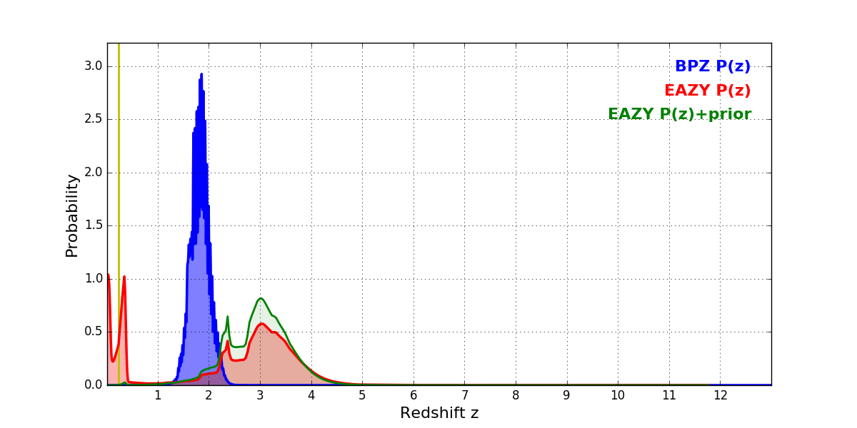 In P(z) plots: Yellow lines mark the cluster redshift z = 0.228,