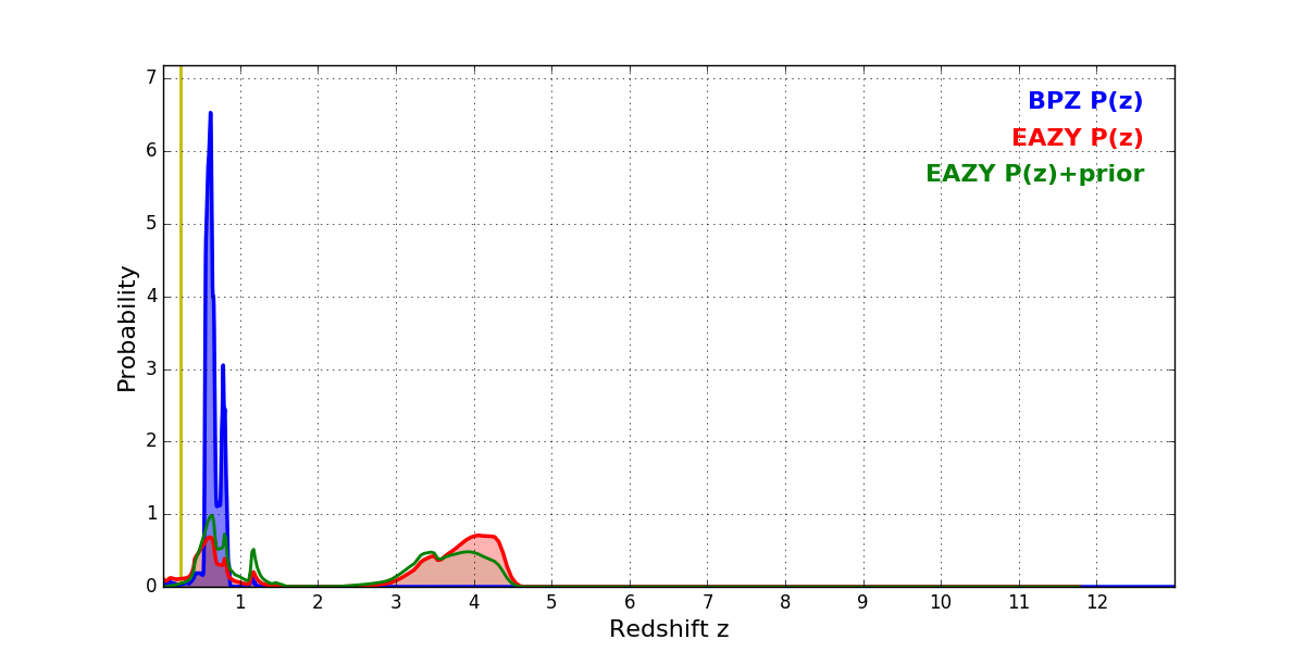In P(z) plots: Yellow lines mark the cluster redshift z = 0.228,