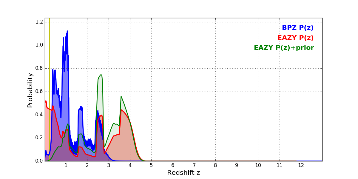 In P(z) plots: Yellow lines mark the cluster redshift z = 0.228,
