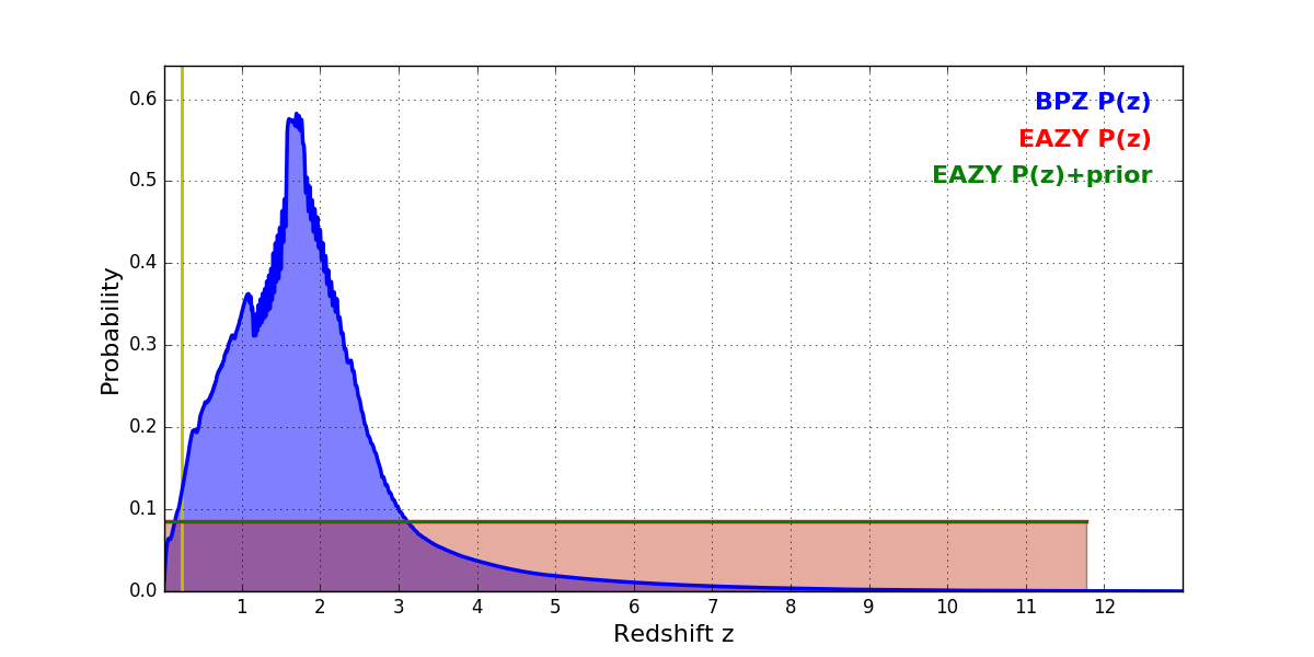 In P(z) plots: Yellow lines mark the cluster redshift z = 0.228,