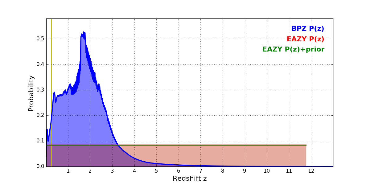 In P(z) plots: Yellow lines mark the cluster redshift z = 0.228,