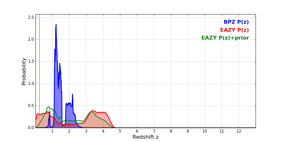 In P(z) plots: Yellow lines mark the cluster redshift z = 0.228,