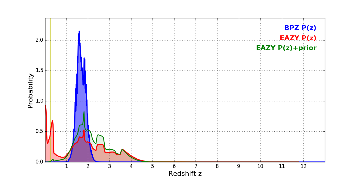 In P(z) plots: Yellow lines mark the cluster redshift z = 0.228,