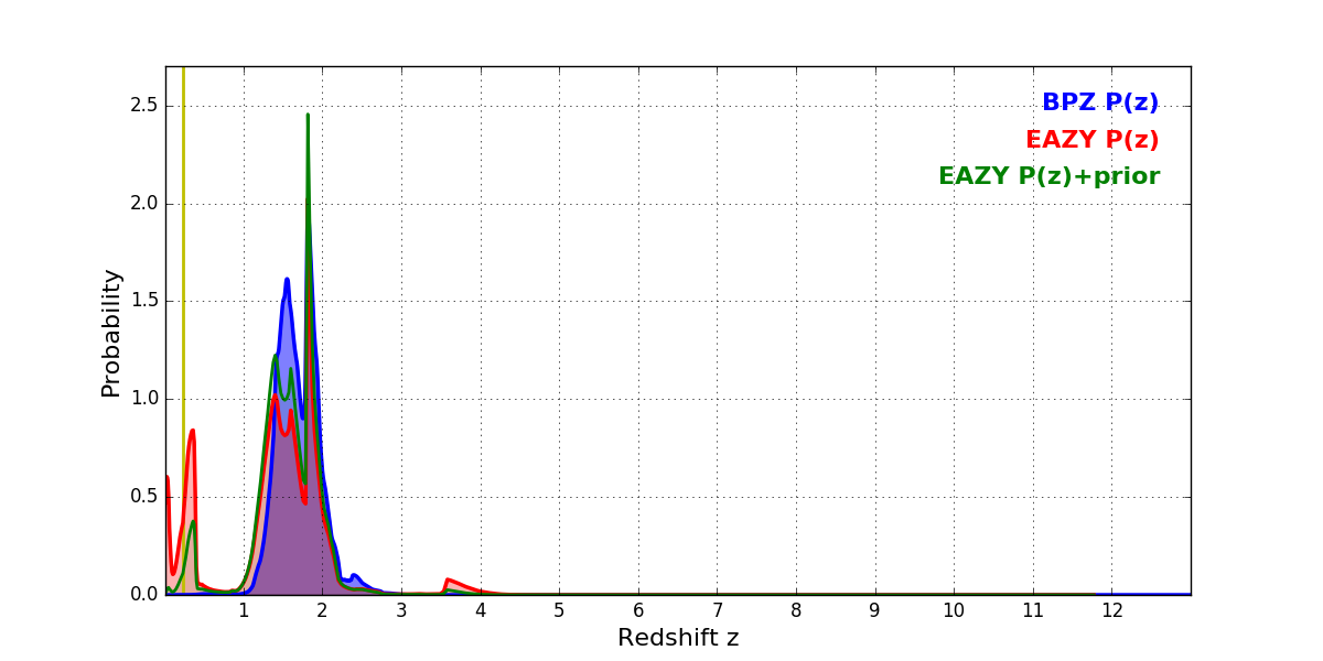 In P(z) plots: Yellow lines mark the cluster redshift z = 0.228,