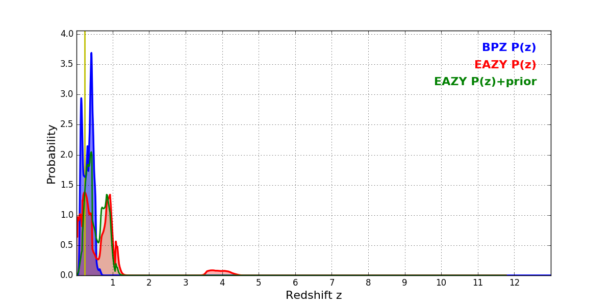 In P(z) plots: Yellow lines mark the cluster redshift z = 0.228,