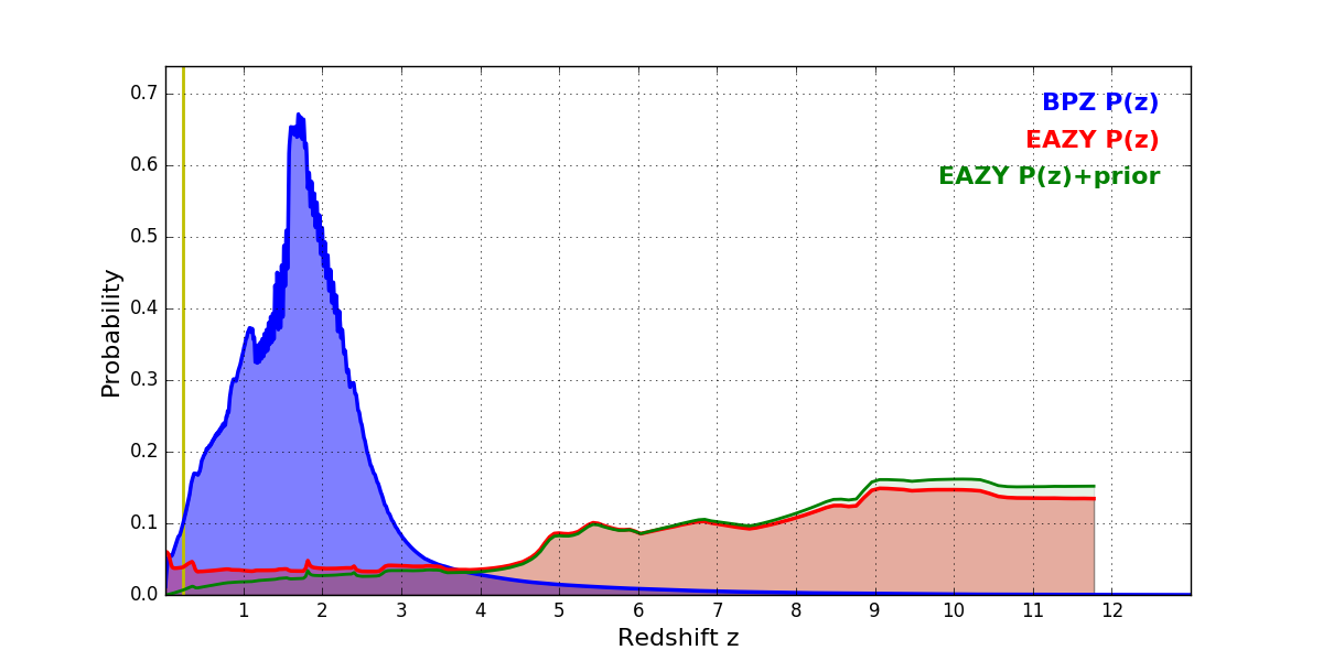 In P(z) plots: Yellow lines mark the cluster redshift z = 0.228,