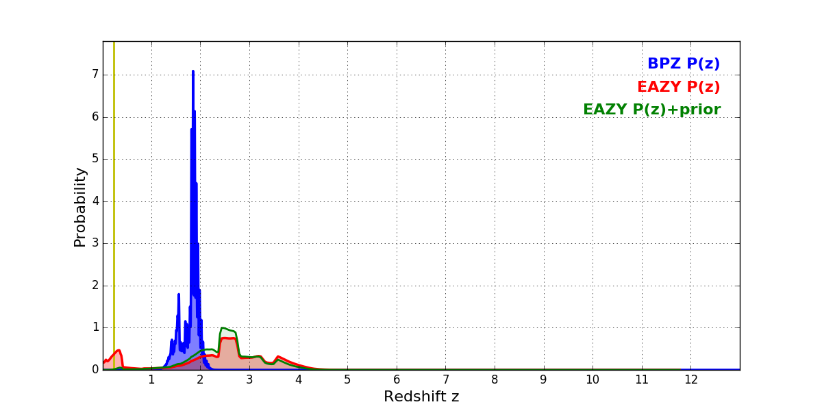 In P(z) plots: Yellow lines mark the cluster redshift z = 0.228,